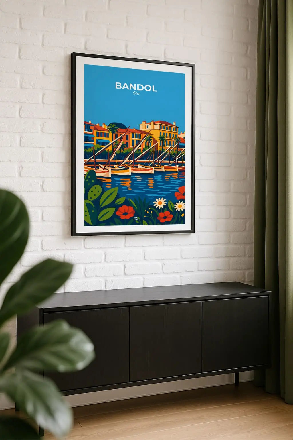Bandol, joyau de la Côte d’Azur, séduit par ses plages dorées, son port animé et ses vignobles renommés. Entre lumière éclatante, mer scintillante et atmosphère conviviale, la ville respire élégance, authenticité et douceur de vivre méditerranéenne. Accrochée sur un mur, cette affiche insuffle une bouffée d’évasion et de souvenirs. Offrez-vous un fragment de ce lieu, ou partagez-le en cadeau à une personne qui porte cet endroit dans son cœur.