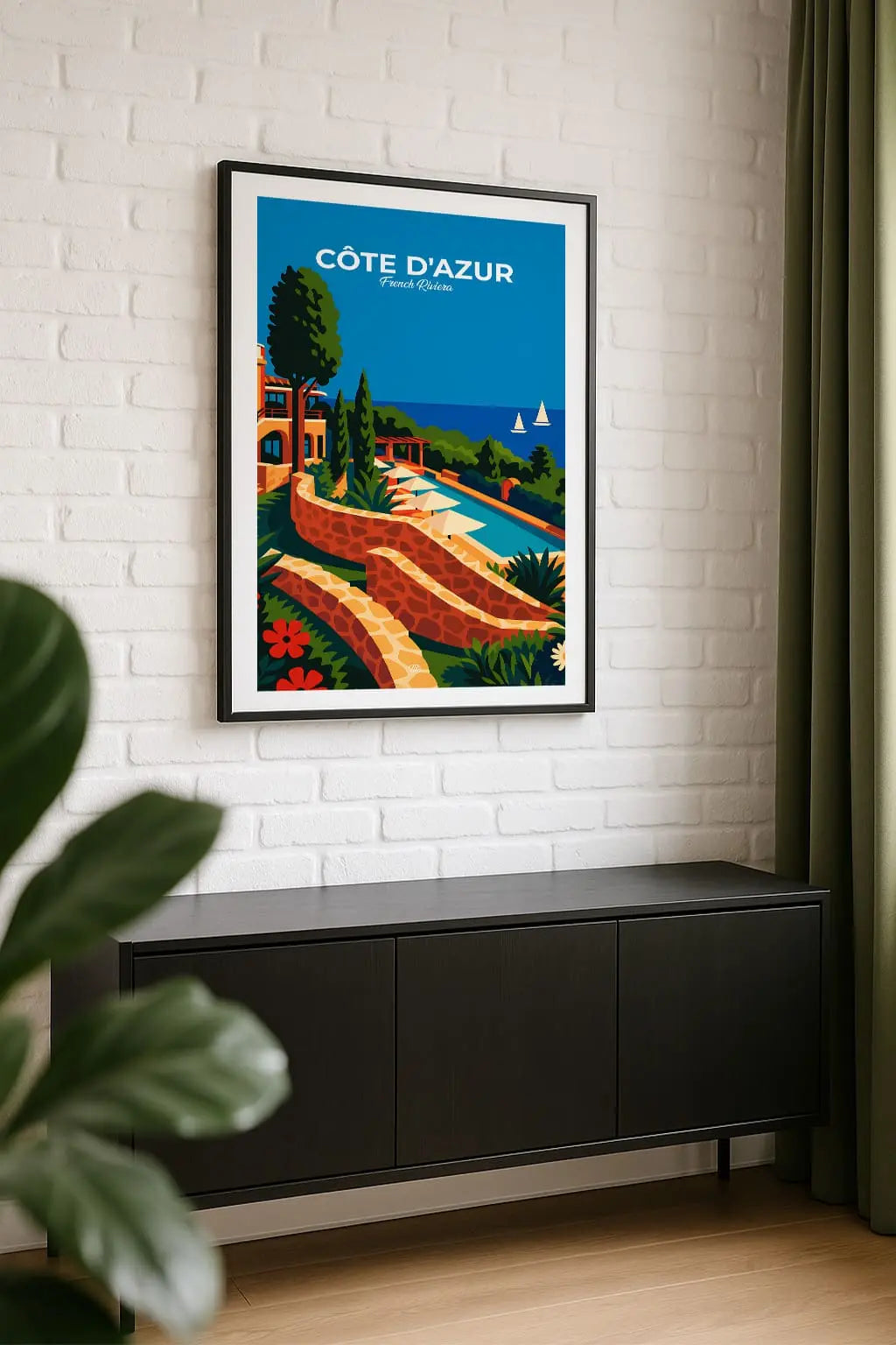 La Côte d’Azur, joyau méditerranéen, déploie plages dorées, eaux turquoise et villages pittoresques. Entre lumière éclatante, glamour et nature préservée, la région respire élégance, douceur de vivre et beauté éternelle au bord de la mer. Accrochée sur un mur, cette affiche insuffle une bouffée d’évasion et de souvenirs. Offrez-vous un fragment de ce lieu, ou partagez-le en cadeau à une personne qui porte cet endroit dans son cœur.