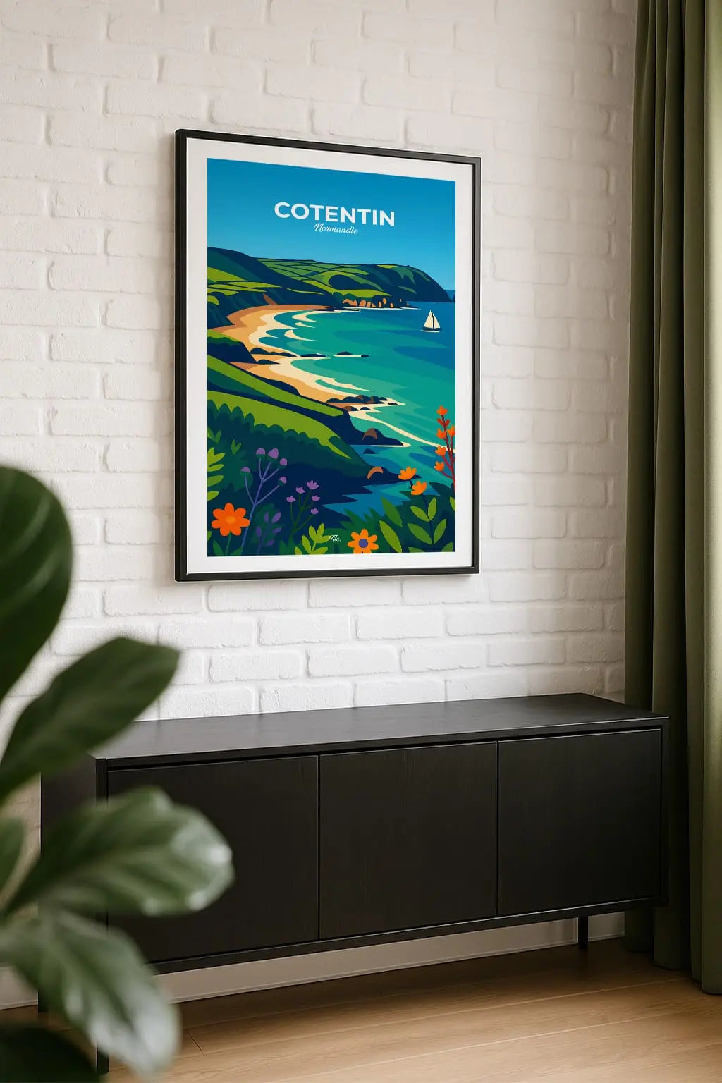 Le Cotentin, péninsule sauvage de Normandie, déploie ses falaises, landes et plages infinies face à l’océan. Entre vents salés, ports paisibles et lumière changeante, cette terre respire liberté, authenticité et beauté naturelle à l’état pur. Accrochée sur un mur, cette affiche insuffle une bouffée d’évasion et de souvenirs. Offrez-vous un fragment de ce lieu, ou partagez-le en cadeau à une personne qui porte cet endroit dans son cœur.