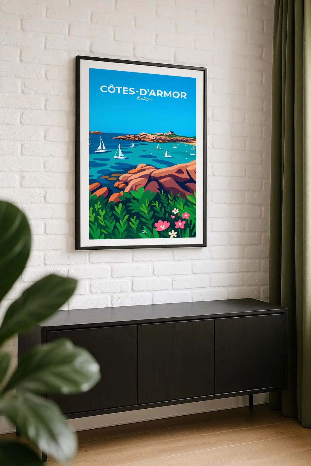 Les Côtes-d’Armor, joyau de la Bretagne, déploient falaises escarpées, plages sauvages et villages pittoresques. Entre lumière changeante, vents marins et patrimoine préservé, la région respire authenticité, beauté et sérénité océaniques. Accrochée sur un mur, cette affiche insuffle une bouffée d’évasion et de souvenirs. Offrez-vous un fragment de ce lieu, ou partagez-le en cadeau à une personne qui porte cet endroit dans son cœur.