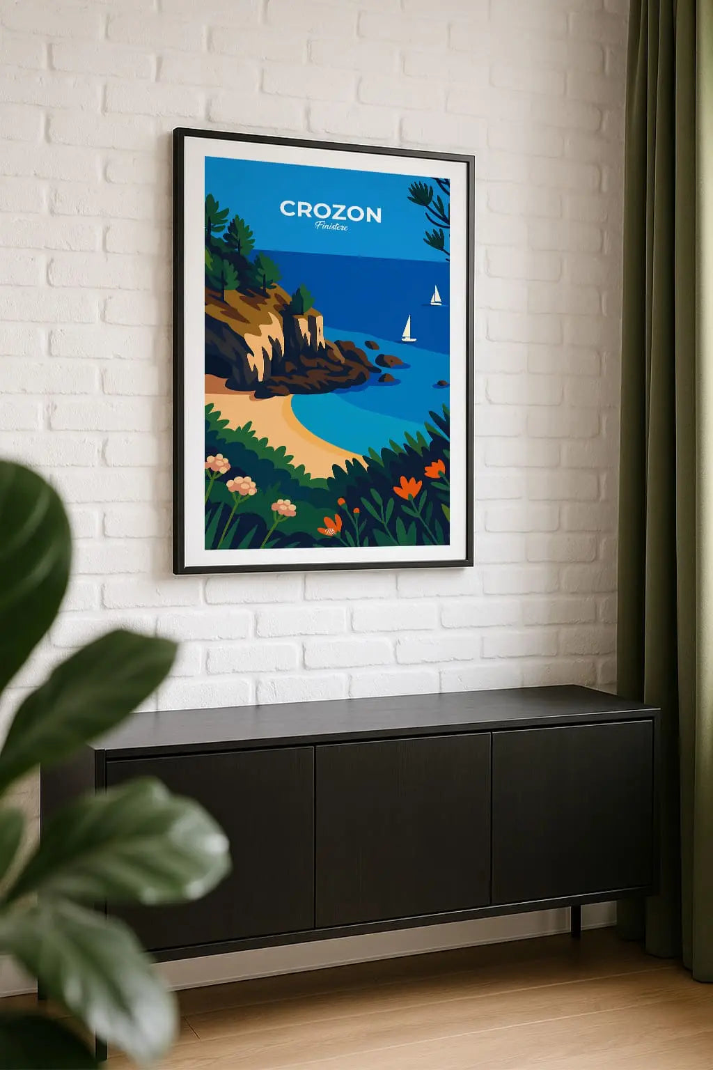 Crozon, au cœur de la presqu’île du même nom en Bretagne, offre des paysages spectaculaires entre falaises, criques turquoise et landes sauvages. Paradis des randonneurs et des amoureux de nature, elle symbolise la Bretagne à l’état pur. Accrochée sur un mur, cette affiche insuffle une bouffée d’évasion et de souvenirs. Offrez-vous un fragment de ce lieu, ou partagez-le en cadeau à une personne qui porte cet endroit dans son cœur.