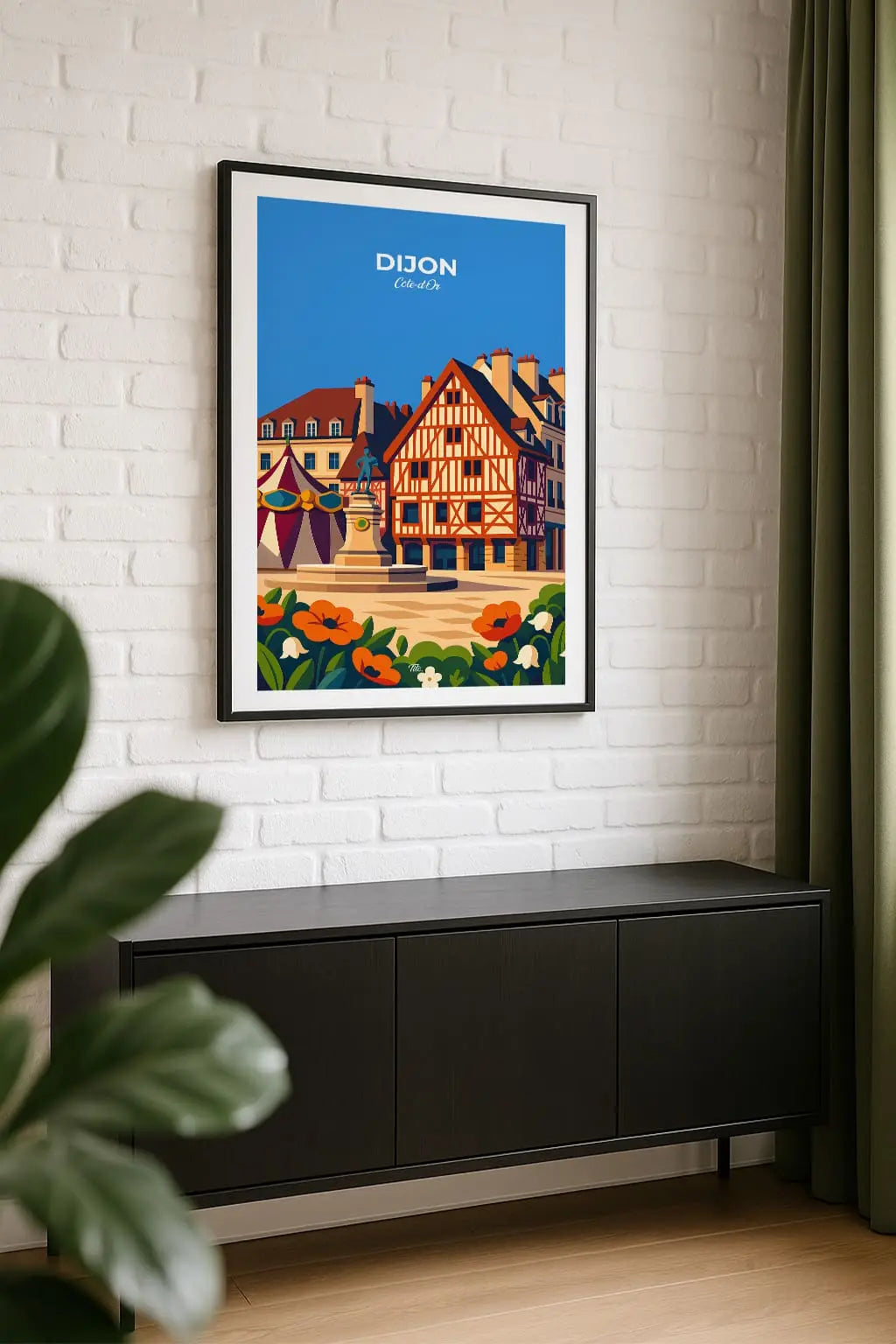 Dijon, capitale élégante de la Bourgogne, séduit par ses hôtels particuliers, ses toits vernissés et ses ruelles animées. Ville d’art et de gastronomie, elle marie histoire et modernité avec raffinement, offrant un savant mélange de culture, de saveurs et de douceur de vivre. Accrochée sur un mur, cette affiche insuffle une bouffée d’évasion et de souvenirs. Offrez-vous un fragment de ce lieu, ou partagez-le en cadeau à une personne qui porte cet endroit dans son cœur.