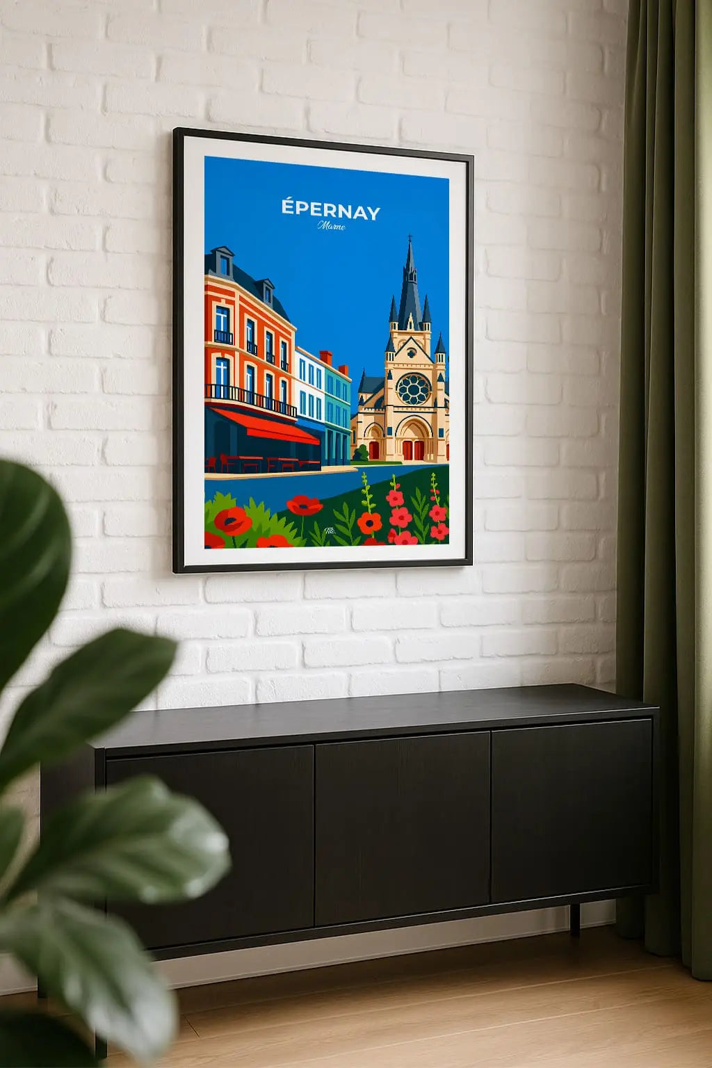 Épernay, capitale des grands vins de Champagne, s’épanouit le long de l’Avenue de Champagne où se succèdent caves et maisons prestigieuses. Entre bulles scintillantes, patrimoine élégant et douceur de vivre, la ville respire la fête, le raffinement et la lumière champenoise. Accrochée sur un mur, cette affiche insuffle une bouffée d’évasion et de souvenirs. Offrez-vous un fragment de ce lieu, ou partagez-le en cadeau à une personne qui porte cet endroit dans son cœur.