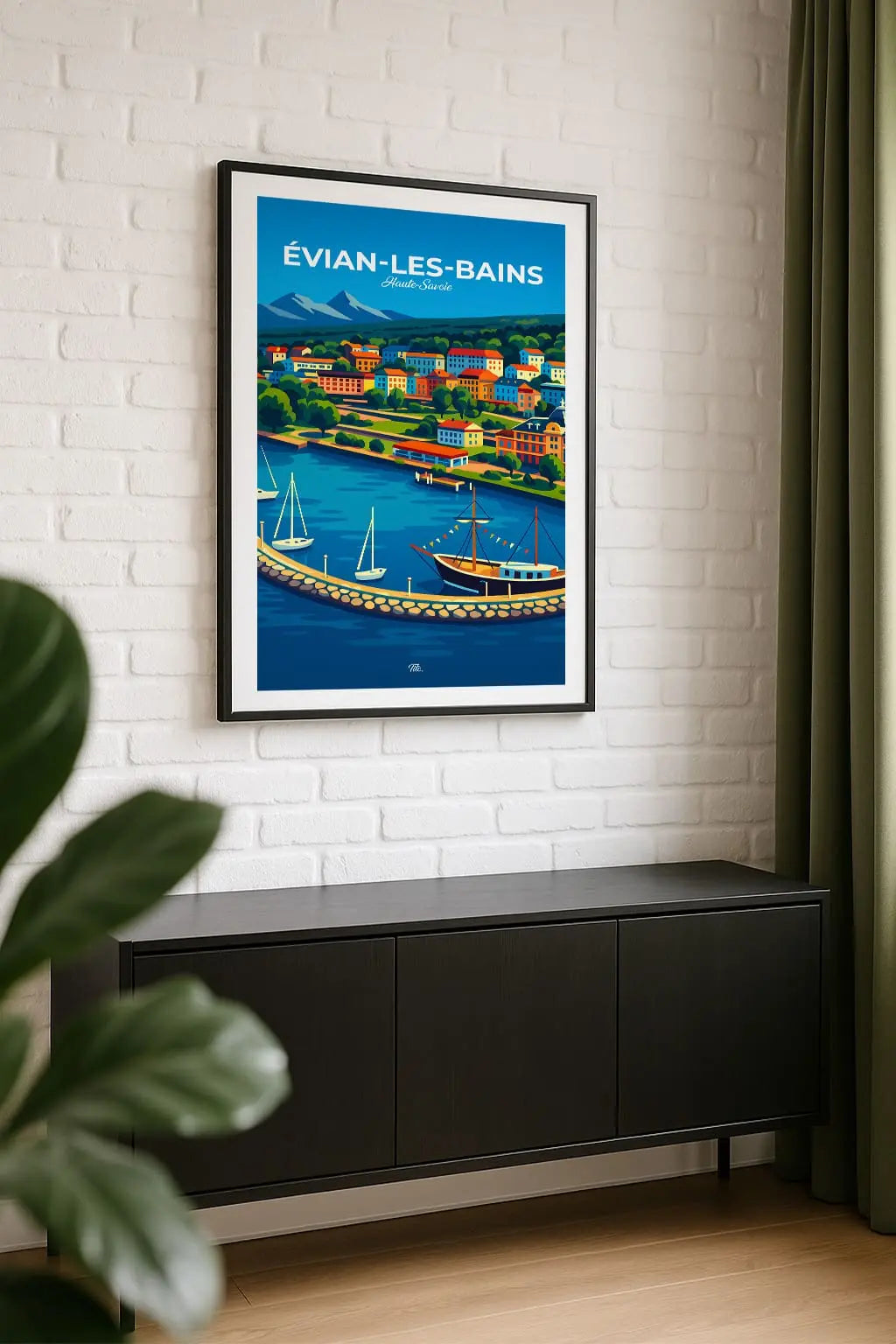 Évian-les-Bains, perle du Léman, charme par son lac scintillant, ses thermes élégants et ses jardins fleuris. Entre montagnes, eau pure et atmosphère paisible, la ville respire raffinement, sérénité et douceur de vivre au cœur de la Haute-Savoie. Accrochée sur un mur, cette affiche insuffle une bouffée d’évasion et de souvenirs. Offrez-vous un fragment de ce lieu, ou partagez-le en cadeau à une personne qui porte cet endroit dans son cœur.
