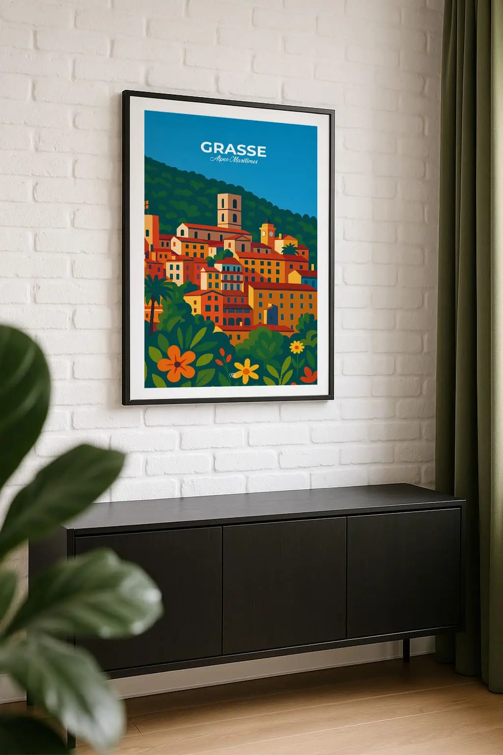 Grasse, capitale mondiale du parfum, séduit par ses collines fleuries, ses ruelles médiévales et ses ateliers olfactifs. Entre lumière provençale, senteurs envoûtantes et atmosphère élégante, la ville respire charme, raffinement et douceur de vivre. Accrochée sur un mur, cette affiche insuffle une bouffée d’évasion et de souvenirs. Offrez-vous un fragment de ce lieu, ou partagez-le en cadeau à une personne qui porte cet endroit dans son cœur.