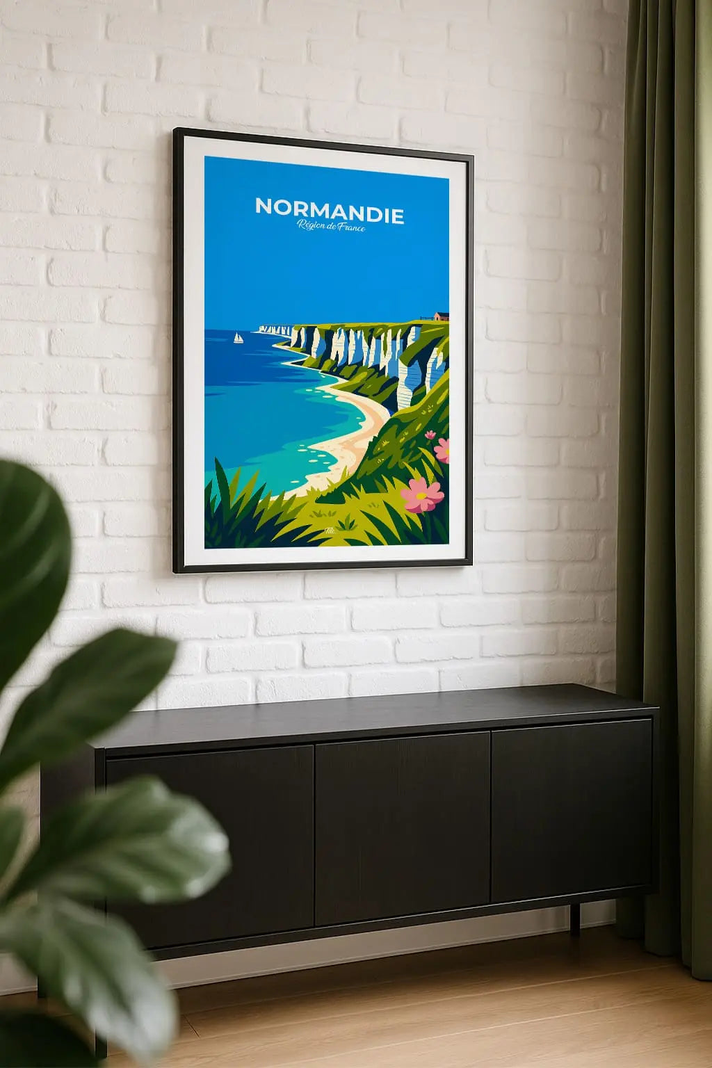 La Normandie, terre de falaises, vergers et plages infinies, déploie bocages, villages pittoresques et cités historiques. Entre lumière changeante, patrimoine et nature préservée, la région respire authenticité, beauté et douceur de vivre au rythme de l’océan. Accrochée sur un mur, cette affiche insuffle une bouffée d’évasion et de souvenirs. Offrez-vous un fragment de ce lieu, ou partagez-le en cadeau à une personne qui porte cet endroit dans son cœur.