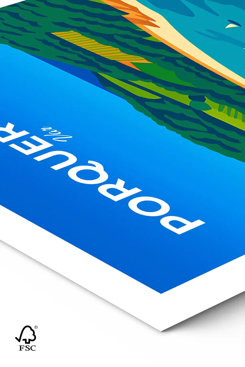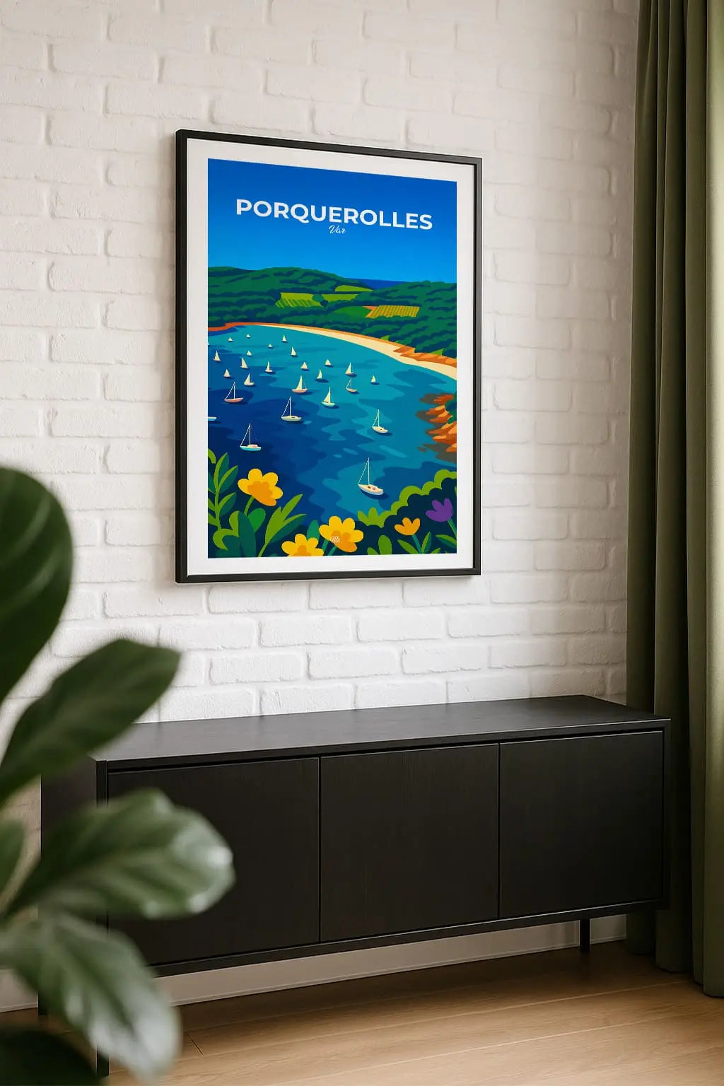 Porquerolles, joyau de l’archipel d’Hyères, séduit par ses plages de sable fin, ses eaux turquoise et ses sentiers parfumés. Entre lumière méditerranéenne, nature préservée et atmosphère paisible, l’île respire beauté, sérénité et douceur de vivre insulaire. Accrochée sur un mur, cette affiche insuffle une bouffée d’évasion et de souvenirs. Offrez-vous un fragment de ce lieu, ou partagez-le en cadeau à une personne qui porte cet endroit dans son cœur.