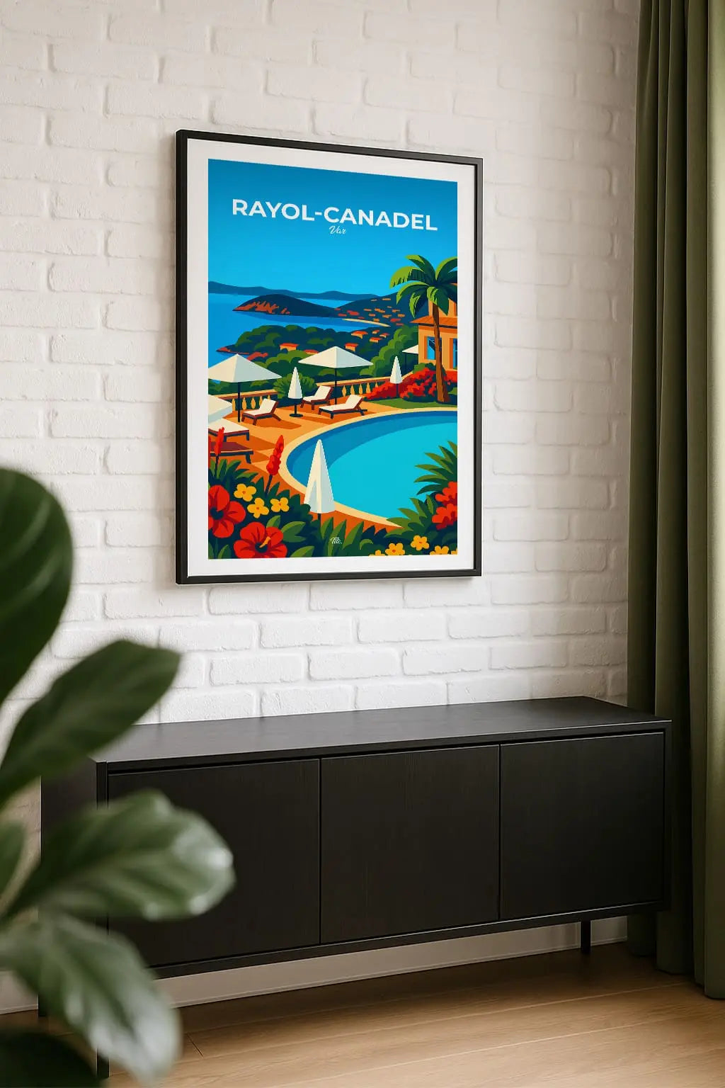 Le Rayol-Canadel, perle du littoral varois, séduit par ses plages dorées, criques sauvages et jardins parfumés. Entre lumière méditerranéenne, mer turquoise et atmosphère paisible, la ville respire beauté, sérénité et douceur de vivre côtière. Accrochée sur un mur, cette affiche insuffle une bouffée d’évasion et de souvenirs. Offrez-vous un fragment de ce lieu, ou partagez-le en cadeau à une personne qui porte cet endroit dans son cœur.