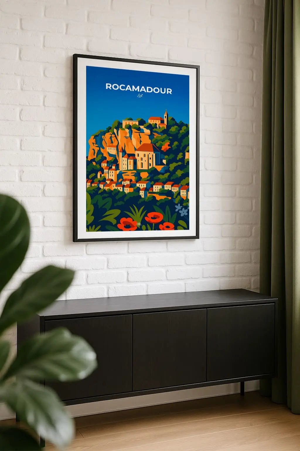 Rocamadour, perché à flanc de falaise dans le Lot, émerveille par ses sanctuaires suspendus et ses ruelles escarpées. Entre pierre dorée, panorama vertigineux et atmosphère spirituelle, le village respire histoire, mystère et beauté intemporelle du Sud-Ouest. Accrochée sur un mur, cette affiche insuffle une bouffée d’évasion et de souvenirs. Offrez-vous un fragment de ce lieu, ou partagez-le en cadeau à une personne qui porte cet endroit dans son cœur.