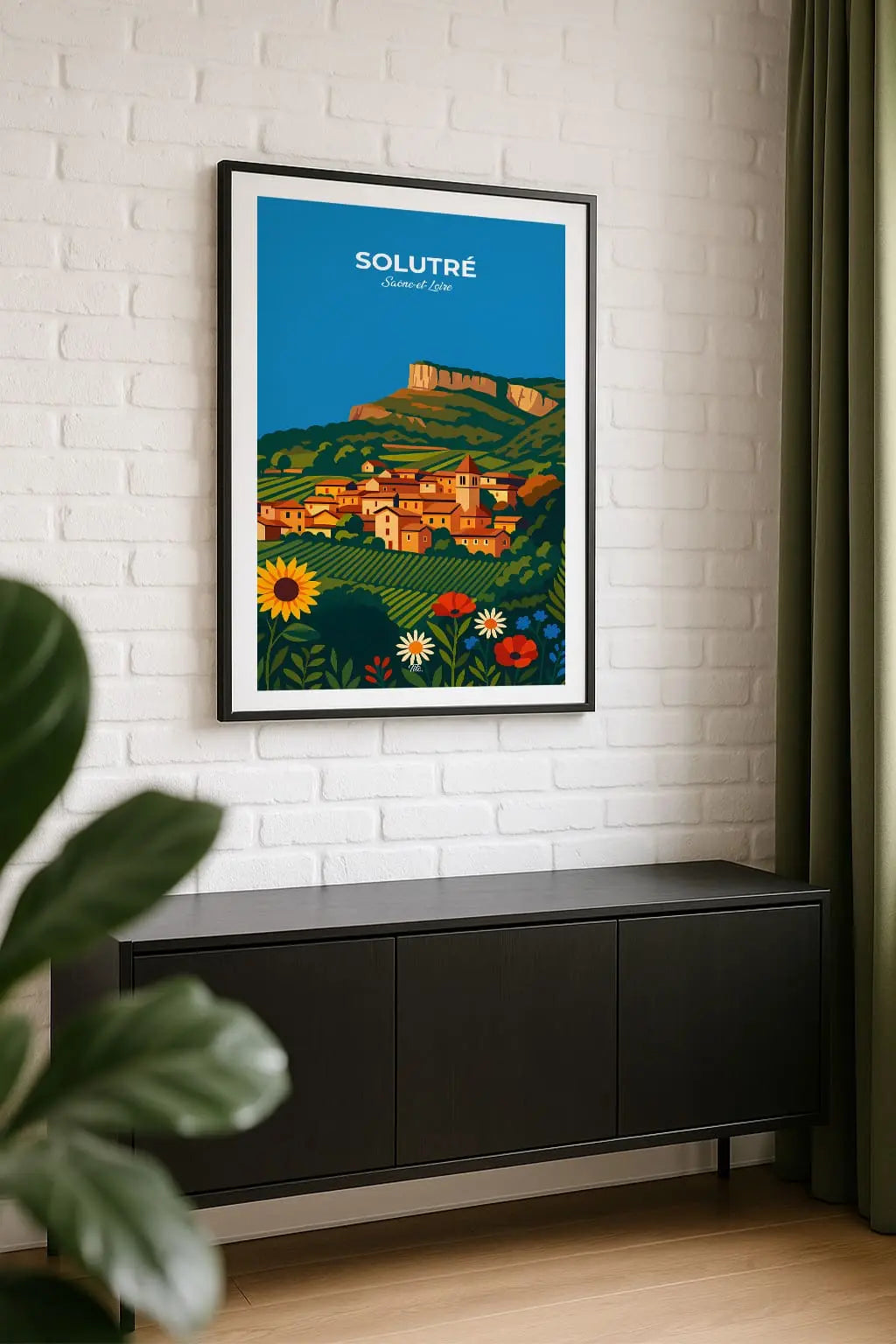 Solutré, dominée par sa majestueuse roche, veille sur les vignobles dorés du Mâconnais. Ce site emblématique, chargé d’histoire et de légendes, unit nature, culture et spiritualité. Entre pierre et vigne, il incarne la force tranquille et la beauté lumineuse de la Bourgogne du Sud. Accrochée sur un mur, cette affiche insuffle une bouffée d’évasion et de souvenirs. Offrez-vous un fragment de ce lieu, ou partagez-le en cadeau à une personne qui porte cet endroit dans son cœur.
