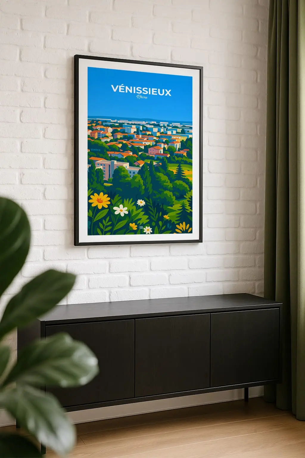 Vénissieux, dynamique commune de la métropole lyonnaise, s’épanouit entre espaces urbains et parcs verdoyants. Entre vie culturelle, activités sportives et proximité de Lyon, elle respire énergie, diversité et convivialité au cœur de la région Auvergne-Rhône-Alpes. Accrochée sur un mur, cette affiche insuffle une bouffée d’évasion et de souvenirs. Offrez-vous un fragment de ce lieu, ou partagez-le en cadeau à une personne qui porte cet endroit dans son cœur.
